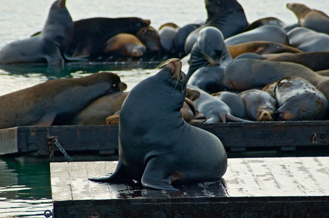 הטיול, האקווריום של מונטריי (Monterey Bay Aquarium). האקווריום מכיל תצוגה מרשימה של היצורים החיים בים ולחופיו: החל ממדוזות בשלל צבעים וגדלים (מי היה מאמין שנתלהב ממדוזות?), דרך יער אצות ועד לדגי ענק ופינות ליטוף של יצורים ימיים (מלפפון ים שנראה דוקרני הרגיש רך כמו ספוג). כל התצוגות עשויות בחוכמה מתוך כוונה להעביר למבקרים את התחושה של הים: האקווריומים ענקיים ( בני 3 קומות), להקות הדגים שוחות במעגל מעל לראשי המבקרים. הילדים התלהבו במיוחד מהאכלת לוטרות הים (אלא מה…), ומהתצוגה של הגאות והשפל. השורה התחתונה: ביקור חובה, לא רק לחובבי יצורים ימיים. www.montereybayaquarium.org סן פרנסיסקו (San-Francisco) איך אפשר לסכם את העיר הכי יפה בקליפורניה בכמה מילים? אולי רק  | | אריות ים מתחממים בשמש ברציף 39 | צילום: ולאד טורצ'נקו |