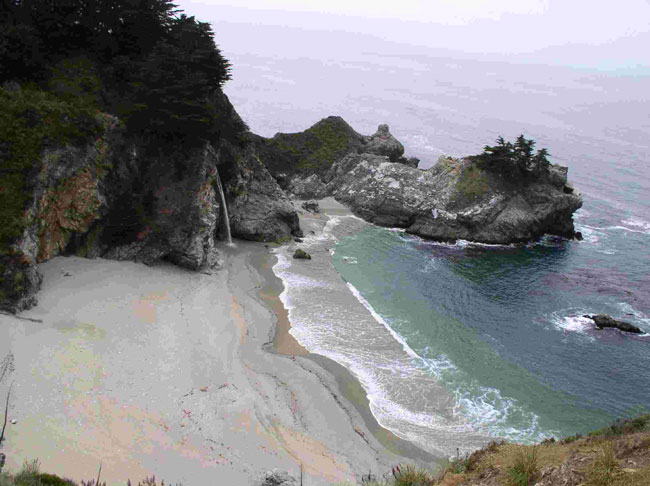 ביג סר (Big Sur) פה מגיע כביש מספר 1 לשיא היופי הטבעי שלו. בקטע של 145 קילומטר, שמתחיל מצפון לטירת הרסט ונמשך עד מונטריי, מתפתל הכביש לאורך האוקיינוס השקט, כשלאורך הדרך נהנים ממצוקים שנופלים לים ומפינות תצפית בצד הכביש, המאפשרות להתרשמות להתרשם מהאוקיינוס ומבעלי-החיים הימיים. בחלק המרכזי של הביג-סר מצוי יער עתיק, שבו מפלי מים ועצי סקוויה ענקיים. עצרנו בשמורת ג'וליה פייפר ברנס, ואחרי הליכה קצרה הגענו למפל היחיד בקליפורניה שנופל לתוך הים. מעט צפונה משם, מצויה שמורת פייפר ביג-סר (Pfeiffer Big Sur), שבה מספר רב של שבילי הליכה מסומנים. בחרנו בשביל שמוביל למפל פייפר, ובדרך נכנסנו לתוך גזעים חלולים של עצי סקוויה עצומי מימדים. טיפים: רצוי להביא אוכל איתכם, כי אין הרבה מקומות לקנייה בדרך והמחירים בשמיים. השורה התחתונה: מומלץ בכל לב. www.bigsurcalifornia.org  | | ביג סר. מצוקים שנופלים לים ופינות תצפית בצד הכביש | צילום באדיבות www.pebblebeach.com |