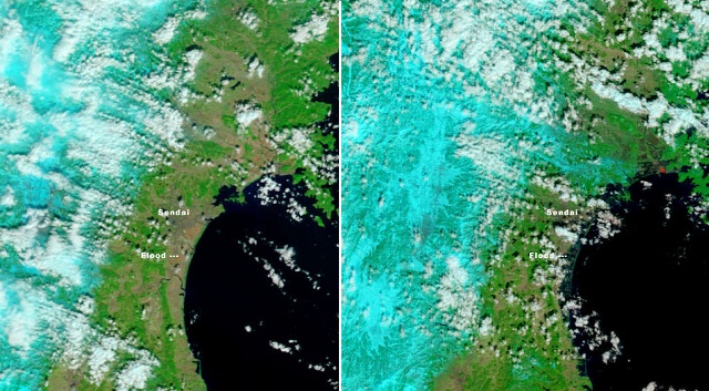 | סוכנות החלל האמריקאית (נאס"א) שחררה תמונת לווין ראשונה מצפון-מזרח יפן המראה את התקדמות גלי הצונאמי אל עבר העיר סונדאי. התמונה מימין צולמה ב-12 במרץ, שעות ספורות לאחר שרעידת אדמה אדירה, בעוצמה של 8.9 בסולם ריכטר, גרמה לגלי צונאמי להציף אזורים נרחבים בצפון-מזרח יפן. התמונה משמאל צולמה באותו מקום בדיוק – מעל העיר סונדאי – ב-26 בפברואר והיא משמשת כנקודת השוואה. בשתי התמונות האוקיינוס נראה ככתם שחור. כשלוחצים על התמונה כדי להגדילה ניתן לראות בבירור שאחרי רעידת האדמה המים מגיעים עד פאתי העיר, בעוד שבדרך כלל בין בתי העיר לאוקיינוס מפרידה רצועת חוף רחבה. |