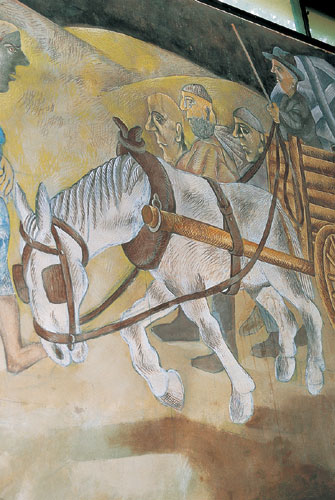 פרט מציור הקיר של אופק בכפר אוריה. בגלל מרקמו העדין והדק של הציור, אין אפשרות להעבירו להיכל אחר