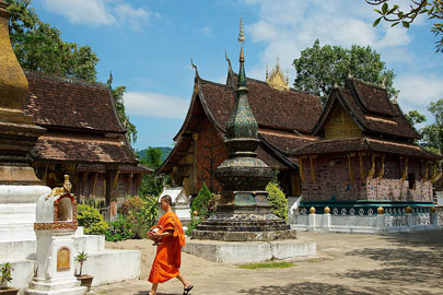 לאוס היא המדינה הפחות מפותחת והפחות ידועה מבין שלוש המושבות הצרפתיות לשעבר בחצי האי הודו-סין (לצד וייטנאם וקמבודיה). רצף הרסני של שלטון זר, מלחמת אזרחים וסוציאליזם נוקשה הביא לבסוף לקריסת המדינה בשנות ה-70, כאשר כמעט עשרה אחוזים מתושביה עזבו אותה. כיום, אחרי שנים של בידוד מהעולם, נהנית לאוס – המיושבת בדלילות וחסרת המוצא לים – משקט פנימי. היא מייצבת את בסיסה הכלכלי והפוליטי ומקבלת במאור פנים מבקרים זרים. היפהפייה הנמה מקיצה משנתה המיתוס הלאוטי קושר את הולדתה של לאוס אל הדרקון הענק – בדרום מזרח אסיה הדרקון מתואר לרוב בהקשרים חיוביים. לפי האגדה, גופו של דרקון הזהב השחיר, התעוות, התפתל והרעיש את יסודות היקום, עד שירדה על הארץ אפלה גדולה. מלועו הפעור של הדרקון פרץ זרם אדיר של מים, הציף את היקום ושכך. הדרקון נרגע, גופו הזהיב, השמש עלתה על פני העולם וייבשה את המים. רק פס מים אדיר זרם במרכז העולם, חום ומהיר, אך רוגע. מתוך הבוץ שעל גדות הנהר בצבצו ועלו בני האדם. אחדים החלו לשתול בבוץ אורז ואחרים נסו במהירות מן המקום, עלו אל ההרים והיערות, נבלעו באפלולית ומשם הגיחו רק כדי להילחם עם אנשי הבוץ. אלה כאלה קראו לנהר "האם הגדולה" (בשפת לַאו טונג, הקרובה לתאית – "מה קונג"). דומה שיש בסיפור זה כדי להמחיש את הקשר בין בני הארץ למרחב הגדול והריק בו הם חיים.  נזיר בחצר מקדש בלואנג פרבאנג | צילום: jmbaud74, flickr