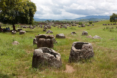 כאשר חוזרים לעיר כדאי לבקר במקדש וואט ווי סון (Wat Wi Soun), שלידו פגודה בצורת אבטיח, ובמקדש וואט צ'ינג טונג (Wat Xieng Thong), שבזכותו הוכרזה לואנג פרבאנג כאתר מורשת עולמית. כדאי גם לחצות את המקונג למקדש Chom Phet, ממנה נשקפת תצפית על העיירה, ולרדת לכפר Xueng Man המטופח להפליא ושמור בידי אונסק"ו. ביום המחרת אפשר לצאת לשיט בן שעתיים על המקונג, נגד הזרם, למערות הבודהיסטיות המפורסמות ב-Pak Ou, שבהן יש מאות פסלים. אפשר לטפס במדרגות למערה נוספת, גבוהה יותר, ובה פסלים נוספים. מפת המסלול מוויאנטיין ללואנג פרבאנג (כולל גיחה למישור הכדים, ראו בהמשך) לחצו להגדלה סיור במישור הכדים המסתורי מללואנג פרבאנג אפשר לנסוע או לטוס בחזרה לוויאנטיין. אבל אם זמנכם בידיכם אל תחמיצו ביקור במישור הכדים שבמחוז סיינג קואנג (Xieng Khuang), ממזרח ללואנג פראבאנג – מגיעים לשם בכביש מס' 7 או בטיסה לבירת המחוז פונסאוואן (Phonsavan). במחוז זה מגיעים הרי צפון לאוס לשיאם בפסגה הגבוהה ביותר במדינה, Phu Bia, בגובה של 2,820 מטר. הנופים ירוקים, ההרים מרשימים והכפרים מאוכלסים בבני שבט המונג (Hmong) בלבושם המסורתי הססגוני להפליא, אולם גם כיום, במרחק של עשרות שנים, קשה להתחמק מהתוצאות המרות של המלחמה בין צבא ארצות הברית לצבא הלאוטי. לא צריך להתאמץ כדי לראות מכתשי הפצצות העגולים שנותרו פעורים בקרקע, ולעתים אפילו חלקי מטוסים הקבורים בשדות הבוציים.  נשים משבט המונג | צילום: jmbaud74, flickr סביב העיירה פונסאוואן נמצאת אחת החידות המסתוריות ביותר של דרום מזרח אסיה – מישור הכדים (באנגלית, Plain of Jars). המישור, שטח עצום בגובה 1000 מטר מעל פני הים, מנוקד כולו במאות כדי אבן ענקיים, המגיעים לגובה של יותר משני מטרים ולמשקל של טון ויותר. איש אינו יודע מה מקורם של הכדים הללו, מי יצר אותם ולמה שימשו. גם מקור האבן ששימשה לבניית כדי הענק אינו ידוע. הסברה המקובלת היא שהכדים שימשו לקבורה ואפשר גם להאמין במסורת המקומית המשעשעת הגורסת כי בכדים הללו הכינו משקאות אלכוהוליים מאורז מותסס לחגיגות הניצחון של מלך מדרום סין שכבש את המחוז במאה ה-6. האזור טרם נחקר כראוי, בין השאר בשל התחמושת הרבה הפזורה בו עדיין.