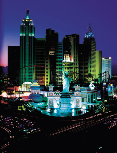 New York New York, המלון-קזינו שנפתח ב-1997. חזיתו מעוצבת כקו הרקיע של התפוח הגדול, עם העתקים מוקטנים של 12 גורדי שחקים ניו יורקיים צילום: באדיבות אם.ג'י.אם מיראז' (MGM Mirage) |