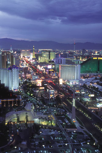 מבט לילי על ה"סטריפ" של וגאס. הסטריפ עבר תהליך המכונה "דיסניפיקציה" – ריכוך תכניו של אתר תיירות כך שיתאים למשפחה כולה צילום באדיבות מחלקת העיתונות של לאס וגאס (Las Vegas News Bureau) |