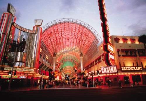 המדרחוב ברחוב פרימונט. הגג, העטור נורות ססגוניות, מספק צל ביום ומקסם אורות לילה | צילום באדיבות מחלקת העיתונות של לאס וגאס (Las Vegas News Bureau) |