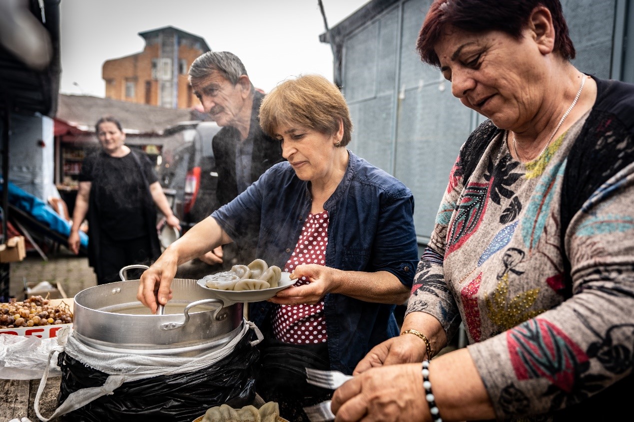 החינקאלי, כיסונים טעימים של בשר טחון העטוף בבצק ומבושל במים רותחים. המוגש חם עם רוטב רותח בפנים .החינקאלי מלווה בריטואל מיוחד של אכילה: מחזיקים אותו בקודקוד הבצקי שלי, קוטמים חלק ממנו בנגיסה, שותים ב"שוט" אחד את המרק שבתוכו ורק אז זוללים את כולו בהנאה.