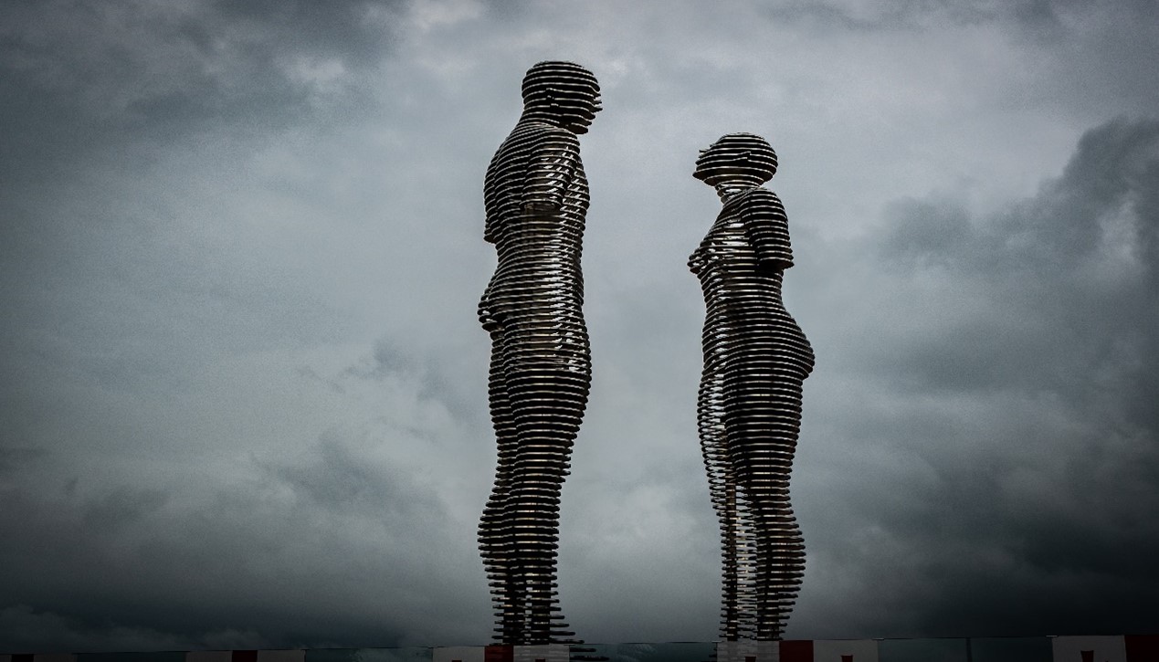הפסל הקינטי העשוי פלדה, סמלה המפורסם ביותר של העיר, מתנשא לגובה של 7 מטרים. מדי עשר דקות, הפסלים נעים אחד אל עבר השני עד להתמזגותם המלאה והתרחקותם בשנית – כסמל לתנועה וההמשכיות האינסופית של מערכת היחסים בין השניים.
