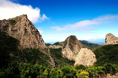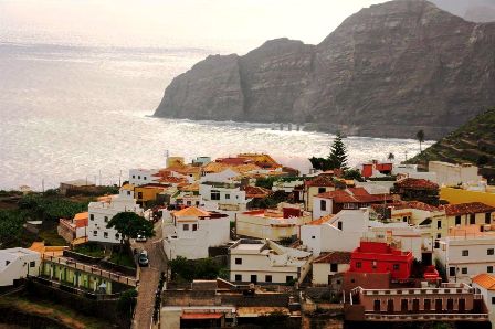 האמת, אני מוטרד. אני יושב במטוס קטן של חברת תעופה קטנה, שזה עתה זכתה בתואר היעילות והנחמדות מבין חברות התעופה האירופאיות הגדולות, מסתכל על האי לה גומרה הקטן וההררי שמתקרב אלי ושואל את עצמי היכן הטייס מתכוון להנחית את המטוס. מלבד עצים וסלעים לא רואים דבר שמזכיר אפילו צלם של מנחת מטוסים. הטייס מנמיך את מטוס עוד יותר. צוקי החוף מתקרבים אלינו במהירות. איפה לעזאזל מסתתר כאן שדה התעופה?.jpg) | | נוף טיפוסי באי. סלעים, הרים והרבה ירק, אבל איפה יש פה שדה תעופה? |