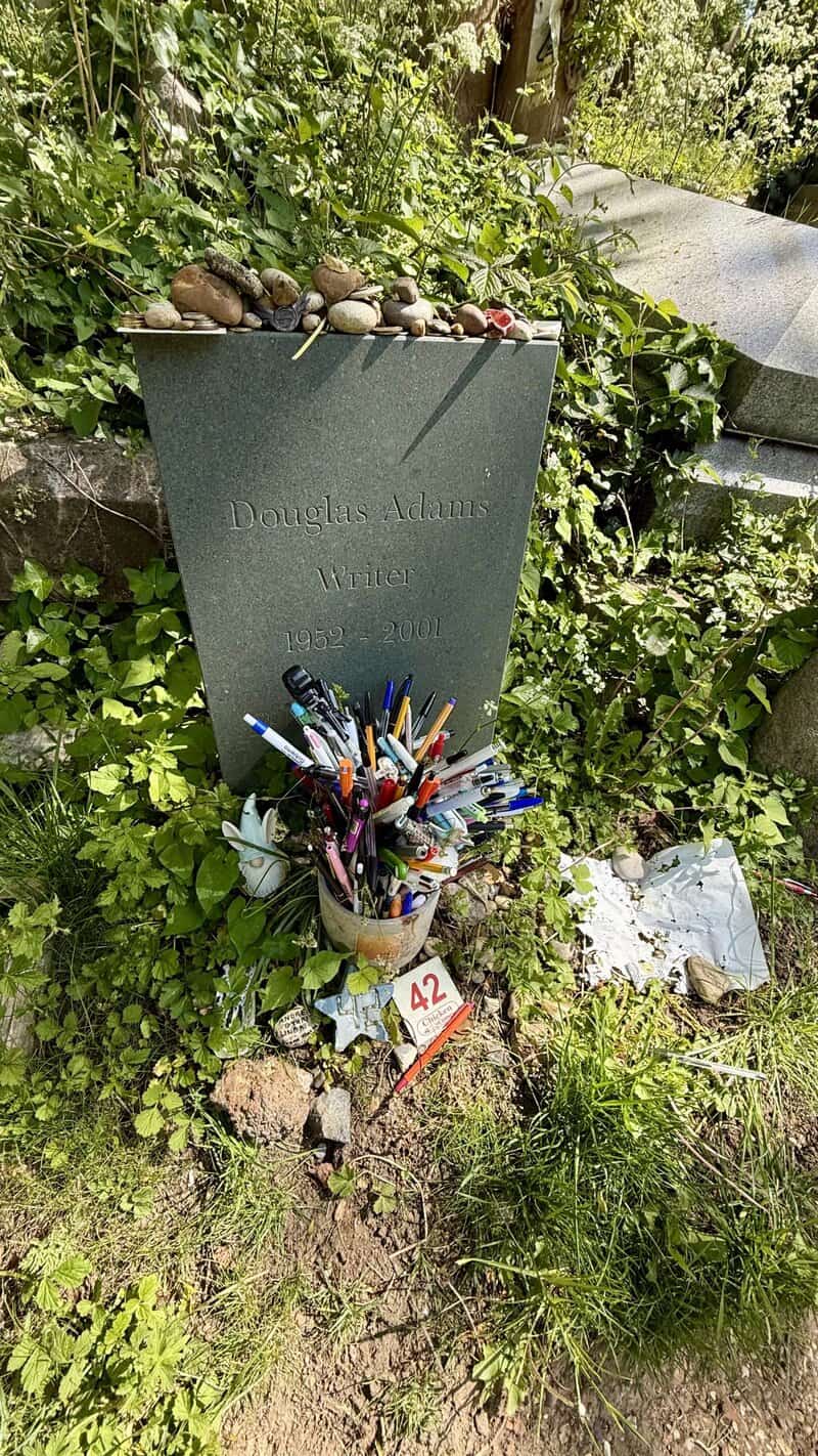 המפגש שריגש אותי היה דווקא עם דמות מודרנית, החבר דאגלס אדמס. תראו כאן את התמונה עם המצבה הפשוטה והעטים. הרבה עטים ומספרי 42.