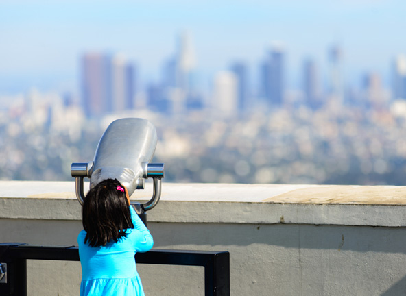תצפית על קו הרקיע של דאון טאון לוס אנג'לס ממרפסת מצפה הכוכבים בפארק גריפית