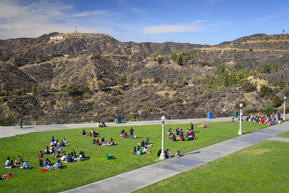 פארק גריפית Griffith Park הוא פארק עירוני מקסים שמספק מקום מפלט מושלם מהמולת העיר. מלבד מדשאות, שבילי הליכה ואופניים ושפע של צמחיה, מספק הפארק המון פעילויות לכל המשפחה: יש פה קרוסלות, מרכז רכיבה על סוסים, רכיבה על סוסי פוני, רכבת קטנה שנוסעת בשבילי הפארק, מגרשי ספורט ובריכת שחייה. אחת האטרקציות המפורסמות של הפארק היא מצפה הכוכבים גריפית' שממנו ניתן להשקיף על שלט הוליווד המפורסם, על העיר כולה וכמובן גם על גרמי השמיים. אטרקציות נוספות בפארק הן מוזיאון התחבורה Travel Town, וכן הגנים הבוטניים וגן החיות, עליהם נרחיב בסעיף הבא.  מדשאות בפארק גריפית, מתחת לשלט "הוליווד" המפורסם