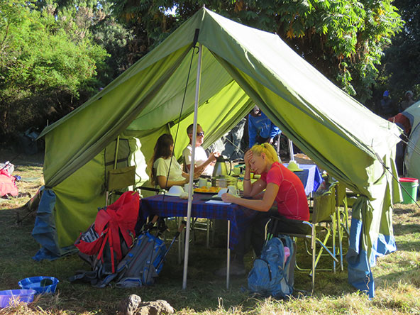 קצת על גסטרונומיה וסדר היום שלנו: מתעוררים בשבע ומשהו. מגישים לנו כוס קפה לאוהל. לאחריה מגיעה קערה עם מים חמימים לרחצה. מתארגנים ומגיעים לאוהל חדר האוכל. כאן מוגשת דיסה חמה, חביתות, צ'יפס, תפוחי אדמה מבושלים.