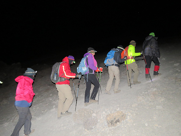 מחנה קיבו גדול יחסית ויש בו אוהלים של קבוצות טיפוס רבות. זה מחנה שמנקז אליו את המסלולים השונים העוברים בשמורה לקראת הטיפוס האחרון אל פסגת ההר. אחרי ארוחת ערב מוקדמת אנחנו נשלחים לישון עד חצות. לקראת חצות מתאספים לארוחה קלה ושתייה חמה. כשאנו לבושים במיטב מעילינו, כובעי גרב וכפפות הסתדרנו להליכה בשורה עורפית. הייתי השני הטור, אחרי ניימן המדריך עצום הממדים. ביד אחת אחזתי במקל, שאת חלקו הקדמי אחז ניימן. בידי השנייה אחזתי במקל הליכה, בעיקר כדי לחוש את הדרך, מרקמה ושוליה.