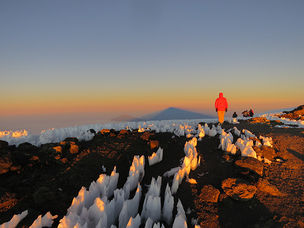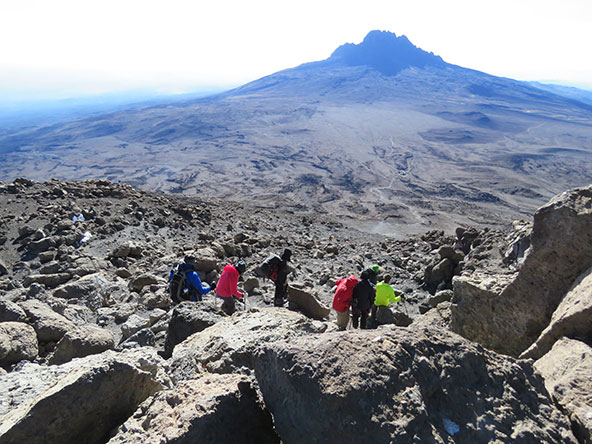 עוד קצת ואנו מגיעים להורו, הנקודה הגבוהה בהר – 5,895 מטר מעל פני הים. קצת צילומים, חיבוקים, והמלווים מאיצים בנו להתחיל לחזור. עד כה, רק יורם ואני לא נטלנו כדורים כנגד מחלת גבהים. שמתי לב שיורם החל ללכת במהירות רבה אל המחנה שבתחתית ההר. לאחר מכן הוא הסביר לי, שהחלה בצקת באצבעותיו, עד שלא יכול היה לכופפן. ללמדכם, שמחלת הגבהים עלולה לגרום לבצקות בגוף, דבר שהחל לקרות ליורם. הבעיה העיקרית במחלה זאת היא כשהבצקת פוגעת במוח, אלו מצבים מסכני חיים.
