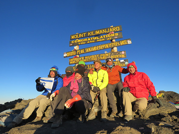 הגענו! הקבוצה בפסגת הקילימנג'רו (ראובן במעיל הצהוב, שלישי מימין)