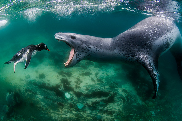 גורל ידוע מראש: כלב ים נמרי פוער פה מול פינגווין באנטארקטיקה. הצילום נבחר לתמונת השנה של ה-BBC | כל הצילומים: עמוס נחום, כל הזכויות שמורות