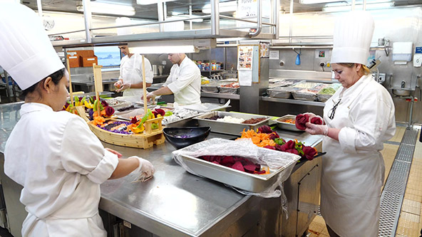 ומה עושים עם כל השפע הזה מהרגע שהוא מאוחסן ועד שהוא מגיע לצלחת שלכם? ובכן, באנייה יש לא פחות מ-85 טבחים שאחראים על הכנתן של 6,500 ארוחות מדי יום. האוכל עצמו מבושל באותו יום שבו הוא מוגש, אבל ההכנות מתחילות יום קודם לכן. בכמויות כאלה, חייבים לעבוד ביעילות, כמו סרט נע. יש טבחים שכל תפקידם הוא להכין את המזון לפני הבישול: הם קוצצים את הירקות, מנקים ומפלטים את הדגים, פורסים את הבשר וכן הלאה.