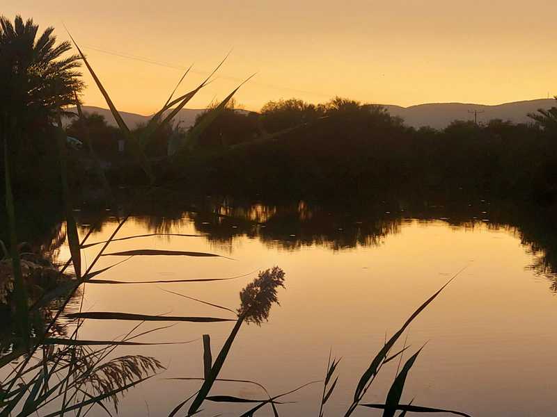 בשבע בבוקר פגשתי את אבנר בחדר האוכל, שתינו כוס קפה עם פרוסת לחם מאפה הבית, ויצאנו לשחיית בוקר בנחל הקיבוצים. אף אחד לא הכין אותי לשפע המעיינות כמו עין מגדל, עין חומה ואחרים שבוקעים מן האדמה וזורמים כמו נהר גדול בלב העמק. הוספתי שמש יפה של בוקר, מים חמימים צלולים ומלטפים של 24 מעלות, אוושת הרוח בצמחי הסוף והקנה ורשרוש עלי האקליפטוסים, צב מים ענק שחמק מן הסלע והשמש אל המים במפץ קטן, שלדג גמדי הדור בצבעי אדום וכחול שהניח לי להתקרב אליו לאט עד למרחק זעום ואז פרש כנפיים והשלים את החלום.