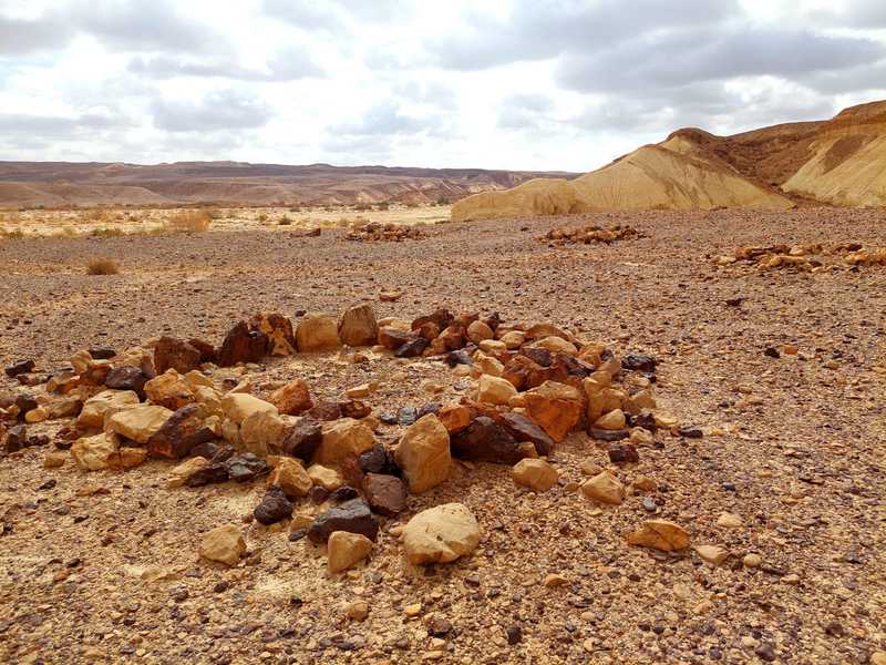 התחלנו ברכס מנוחה, החצר האחורית של מושב פארן. אני נהגתי והבטתי בתפאורת הסלעים והאדמה בגווני צהוב וחום על רקע השמיים הכחולים. כברת דרך קצרה וכבר ירדנו וניגשנו אל גל אבנים. גדעון הצביע על מעגל אבנים, וצירף להם קורות עץ וסכך. בדמיוני נוצרה סוכה עגולה, מחסה משמש היום וקור הלילה של המדבר. "כאן, בין הסלעים מצאתי מחרשה" סיפר לי גדעון "יש הרבה עדויות שאנשי המקום עסקו גם בחקלאות".