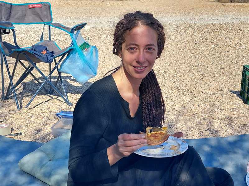 ביום היה נפלא, טיילנו בג'יפ וברגל בנופי מדבר, ביקרנו אתרי מקדשים ופולחן, צפינו ביותר ממאה צבאים בנחלים ציחור וצניפים. לעת ערב התמקמנו בחניון לילה מתחת לעצי השיטים, הדלקנו מדורה והכנו פויקה מסורתי צמחוני עם בקבוק יין אדום. הלילה היה קר. בבוקר נזקקנו לזמן הפשרה ארוך תחת השמש מקיפאון הלילה. כוס קפה ועוד אחת ותה עם מרווה בנוסח בדואי מתוק על האש. ואז הגיע הג'אפל. הפרדתי פיתה קטנה לשתי פרוסות והנחתי על כל צלחית אחת מהן, טיפטפתי שמן זית והוספתי מכל טוב, פסטו, טחינה, גבינה צהובה, פרוסת חציל מטוגן, עגבניה חתוכה דק, וכיד הדימיון הטובה והבקשות מסביב. סגרתי בתנועה מהירה והכנסתי אל הגחלים במדורה. קולות הבישול התפצפצו מתוך המדורה. הפכתי מצד לצד ואחרי חמש דקות הוצאתי את הג'אפל מן המדורה ופתחתי את הקשוות. המאפה במדורה היה צרוב ולוהט, הדיף ריחות לכל עבר וטעם גן עדן מן המשובחים. הילה הוסיפה ופתחה ביצה על הג'אפל שלה וקיבלה ביצת עין בתוך הפיתה שלה, עם כל התוספות.