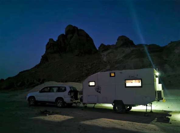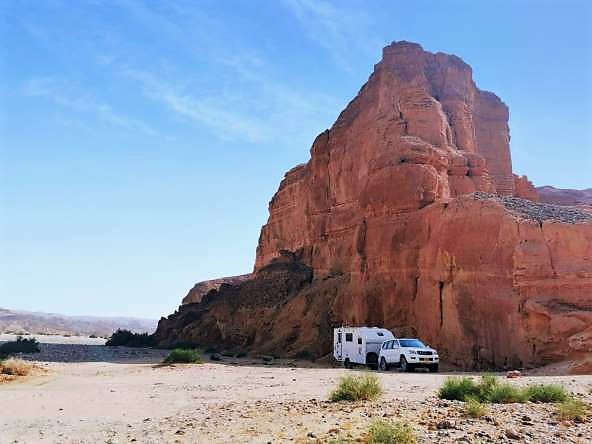 בסוף היום נותרתי לבד בנוף קדומים. השמש שקעה ושעת דמדומים ארוכה נחה על המדבר. דרך עפר טובה חצתה את אפיק נחל פארן, נסעתי לאט גומע את המרחבים דרך עיני אל לבי, מזון לנשמה. משאית ארוכה הזדחלה מולי והעלתה ענן אבק שסר מהדרך עם הרוח. טנדר לבן עקב אחריה והנהג נפנף לי לשלום. בטח קבלן שסיים עוד יום עבודה בבסיס נידח ונמצא בדרך מסוף העולם הביתה, מביא פרנסה, מקבל אשה, קירות, ארוחה חמה, טלוויזיה, ילדים. שלט ירוק כיוון אותי אל חניון לילה בארות עדה. מעגל אבנים מפויח סימן מדורה מלפני ימים ספורים. עצרתי במישור למרגלות צוקי אבן חול. אור אחרון צבע באדום שהתחלף לשחור את ההרים, מותיר שמיים כהים פחות עם אינספור כוכבים. חום המדבר נמוג אל קרירות נעימה. אני פותח כיסא ברזנט, מתרחק מעט ומתיישב עליו. מבט אל הג'יפ הלבן, הקרוואן שמפיץ אור לדים סביבו, על רקע שמיים כהים והר כהה עוד יותר. לבד במדבר, זמן למחשבות.
