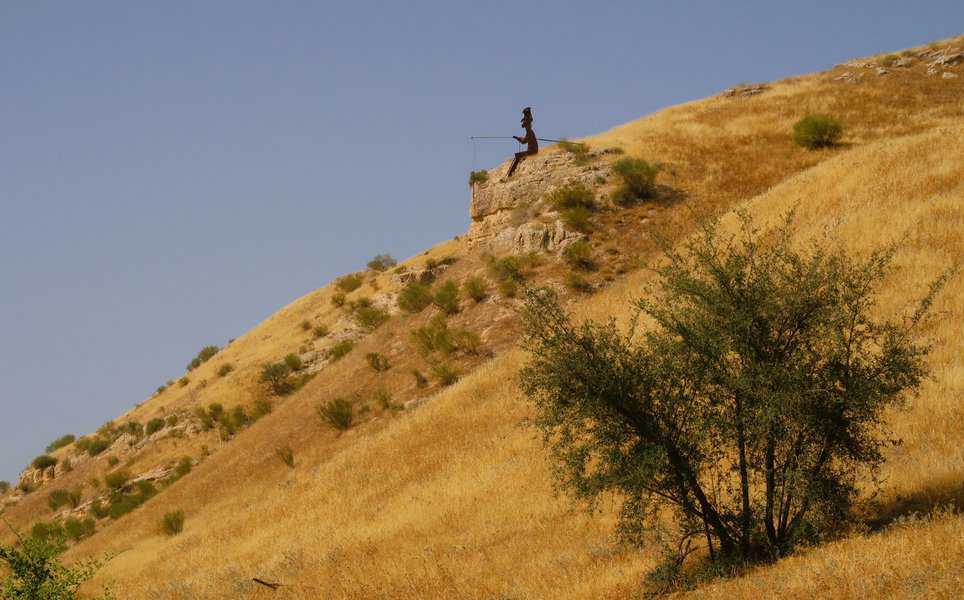על מורדות הגולן בואכה ים כנרת, מעט צפונה מקיבוץ עין גב, יושב דייג של ברזל על צוק, חכה בידו והוא משקיף אל נוף האגם המרהיב. חדי העין יכולים להבחין שבקצה החוט לכד הדייג את אגם הכנרת. בדיקה בקרב מארחי בחוות עין תאנה העלתה שיוצר הפסל הוא עוזי קרן, ומכאן, בית הקרוואן שלי בחווה, ועד לביתו בקיבוץ עין גב הדרך היא קצרה.