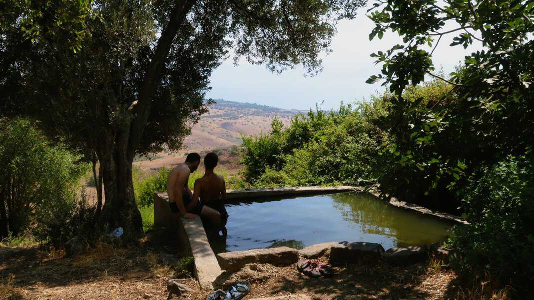 שנים לפני כן במהלך מלחמת ששת הימים הצטרף ירח לכוח שיצא מהאון ועלה אל הכפר הסורי תאופיק. בדרך הבחינו עיניו המנוסות בסימני חומה, שוקת וסבך של שיחי פטל, סימנים מובהקים לקיומו של מעיין ובריכה לצידו. ירח סימן לעצמו את הנקודה לשוב אליה בעתיד. חלפו יותר משלושים שנה, כאשר בשנת אלפיים התחוללה שריפה גדולה וסבך הפטל עלה באש. שריפות הן גם הזדמנות בעיניו החוקרות של הסקרן. ירח גילה טפח ועוד טפחיים ומעתה בימי שישי היה מטפח את אנדרטת הטייסים התורכים, ובימי שבת היה מעמיס טוריה ומכוש וחופר את ברכת המעיין. שלוש שנים עבד ירח כמעט לבדו, עם קצת עזרה מידידים ומשפחה עד שהוביל את מי המעיין לבריכה המשופצת והחזיר את גן העדן למקומו הראוי. ערימות העפר שפינה מן הבריכה הפכו לטראסות וירח שתל בהן עצי פרי.