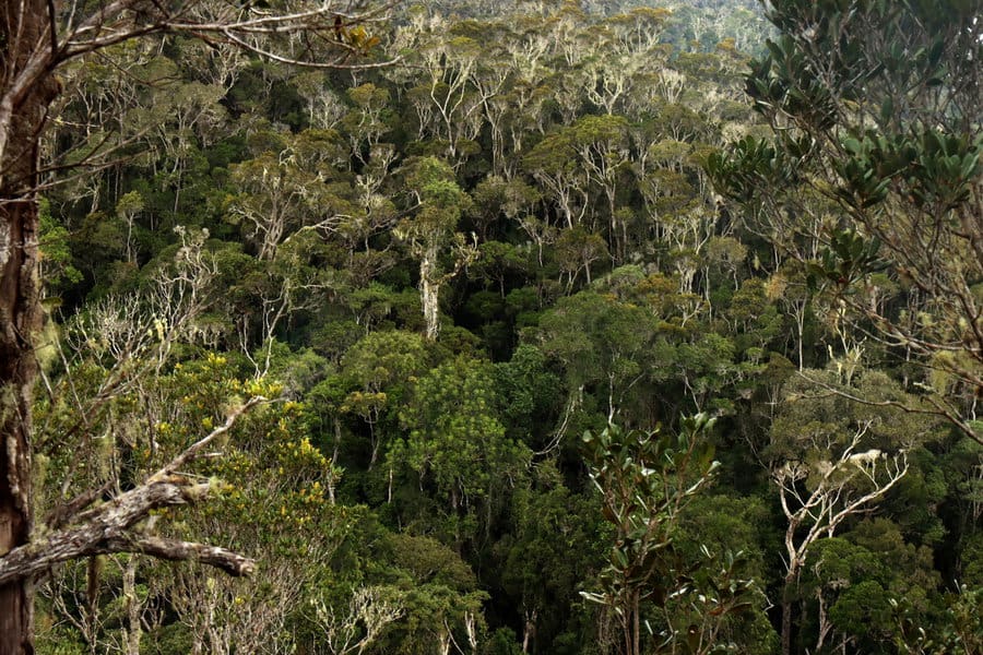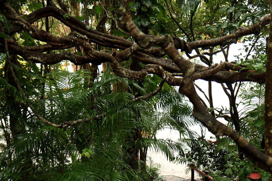 מעת לעת נראו ציפורים ביישניות. המקום מעיד על המגוון הביולוגי יוצא הדופן וליופי הטבעי הכובש של האי. הלכנו בשבילים צרים, דרכנו על השורשים, שרובם פרוסים על פני הקרקע, משום שמרבית ההמוס, חומרי המזון ביער הגשם, נמצאים בעצם על הקרקע. פילסנו את דרכנו בין הליאנות, שורשי האוויר ששלחו העצים וחלקם היכו שורשים בקרקע. צועדים בתוך הירוק האינסופי של הצמחייה הסבוכה. מסירים מדרכנו שרכים, עלים קוצניים הדוקרים כמחטים, מרימים רגליים כדי שלא להיתקל בשורשי העצים המרשתים את השבילים הצרים, שואפים את ריחו הטחוב של היער, נעצרים ליד זיקית צמודה לגזע עץ, מרימים ראש אל ציפור מזדמנת,