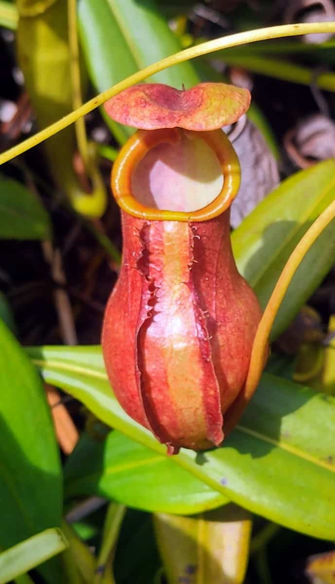 מסתבר כי בעולם קיימים 600 מינים של צמחים טורפים יש בעולם – רובם על קו הרוחב 20, והנה כאן, בביצה חסרת שם, גדלם שני מינים ולהם גביעי מלכודת מרהיבים, שלמקומיים מזכירים צורה של קונדום… לאחד גביעים צהובים עם נקודות חלודה ולשני – גביעים כתומים-אדומים.