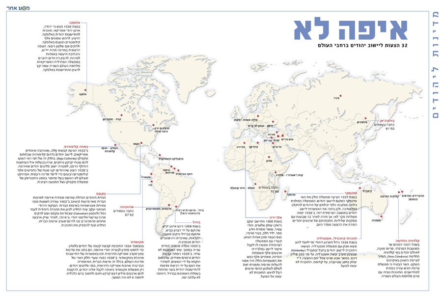 מה היה קורה לו במקום בישראל, היהודים היו מקימים מדינה באי קלדוניה החדשה שבאוקיינוס השקט? האם החיים תחת שלטון ריבוני יהודי באלסקה (עם יידיש כשפה רשמית) היו עולים יפה? וכיצד היתה נראית ההתיישבות החקלאית של יהודים בברזיל לוּ הפרויקט של הברון הירש היה קורם עור וגידים? הזויות ככל שיישמעו, ההצעות להקים מדינה יהודית באוסטרליה, באלג'יריה, באקוודור או במדגסקר נידונו בכובד ראש והן נשמעו ריאליות לא פחות מהרעיון להקים מדינה כזאת דווקא בישראל, שאז נקראה פלשתינה. מתוך 32 הצעות ליישוב יהודים ברחבי העולם (ראו מפה), ליקטנו תשע הצעות, המובאות פה על פי סדר האלף-בית. כולן מרתקות, למרות שאף אחת מהן לא צלחה. אוסטרליה בשנת 1938 ניהל הארגון היהודי פריילאנד ליגע משא ומתן עם ממשלת אוסטרליה. הנושא: התוכנית ליישוב יהודים בחבל קימברלי (Kimberley) שבצפון-מערב יבשת אוסטרליה, על פני 260 מיליון דונם. במשך שבע שנים עמל יוזם ההצעה, ד"ר יצחק נחמן שטיינברג, על קידומה. התוכנית לא יצאה לפועל.  האם לכאן היינו מטיילים בסופי שבוע? אזור קימברלי באוסטרליה | צילומיםף שאטרסטוק