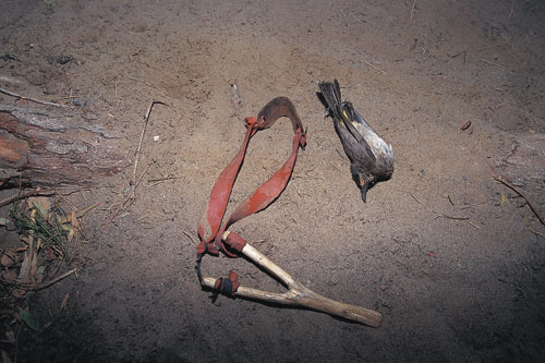 התאילנדי שלו: "הוא צד ובישל בחבית אחת חסידה ועגור. החבר'ה האלה יודעים איך לחיות בשטח". לאחר מכן צפיתי בטיול שבת של עובדים תאילנדים. רבים מהם אחזו ברוגטקה. מדי פעם הם התכופפו לארץ וקלעו ברוגטקה לאוויר. המראה הבא היה של ציפור נופלת ארצה אחרי שראשה רוסק בפגיעה מדויקת ומיומנת.
