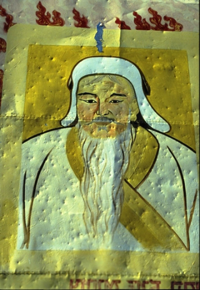 דיוקן של גינגס חאן על לוח פח בכניסה לחטגל | צילום: ספי בן יוסף