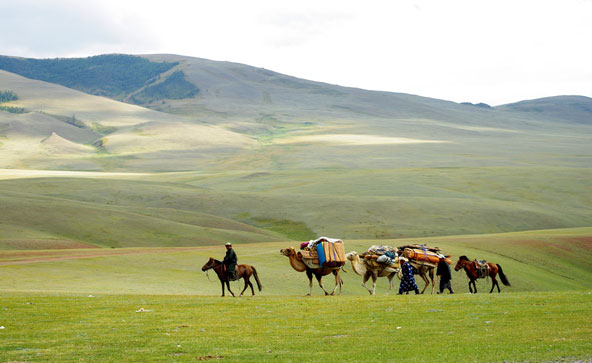 על הדרך הראשית העולה מלב הערבה המונגולית אל אגם חובסגול, בגבולה הצפוני של הארץ, סמוך לאירקוצק שבסיביר (הרוסית), עוברת מדי יום משאית אחת רעועה ואולי גם שלושה אופנועים, שהשד יודע מהיכן משיגים בעליהם את הדלק למסעם. בימי הסתיו, הם ימי "המסע בעקבות ג'ינגיס חאן", עוברת בדרך הזו מדי כמה ימים גם שיירה של נודדים שפרקו את אוהליהם, עמסו את כל המטלטלים על עגלות ישנות שגלגליהן עץ, והן רתומות לשוורים או ליאקים סבלניים, וכך, בקצב הבקר האיטי מתנהלת שיירה של אנשי ערבות מונגוליים. היאקים סוחבים את העגלה, העגלה את הגֵר המתקפל, סוס קטן סוחב מונגולי גדול על גבו, וגם אישה וילד ואת החברים' וכולם זוחלים אט-אט אל מקומות שהחורף הקר קל בהם יותר. ועוד על הדרך – פרשים עטויי גלימה וחמושים ברובים עתיקים ואבנט מפואר, יושבים על גבי סוסיהם ואין לדעת מהיכן להיכן הם נעים.