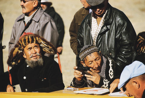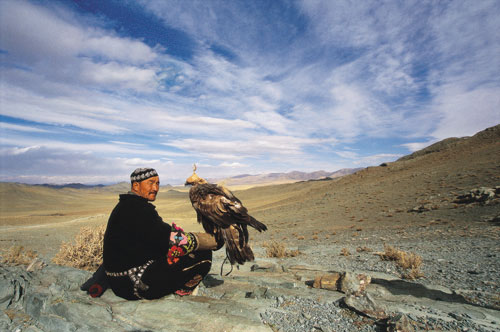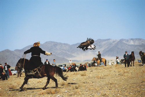 הציידים חומסים את העיטים מקיניהם בהיותם גוזלים, וכך מפתח העיט תלות בשובהו. הצייד – איש טבע הבקי באורחות העופות וטבעם – מלמד את העיט הצעיר לצוד כאילו הוא הוריו המכונפים. לאט ובסבלנות הוא מרחיק את קו האתגר של העיט שלו ומפתח, בתבונה של מדען, את תכונותיו של הדורס ואת האינסטינקטים שלו, כלומר לרחף בדממה בגובה רב, לאתר ציד, לעוט עליו בהפתעה ולמחוץ אותו למוות בטפריו העצומים. זה גם הזמן שבו הצייד, הצופה מגבעה גבוהה או מדרון הר במעללי בן טיפוחיו, דוהר אליו ומחלץ את החיה שניצודה מטפריו וממקורו הקורע כל. שועל בר מזל רכונים על מרק בשר מעורב בשומן ובחלב ניסינו לברר אצל הצייד איך חי מיעוט אתני כמו הקאזאקים במדינת הנוודים מונגוליה. הוא לא עפעף כלל כשבמקום תשובה ישירה, תיאר את מסע הציד שלנו, שהסתיים לפני זמן קצר. בדבריו חזר אראלביי אל ההרים והסיט אותנו מהשאלה המתריסה. בשעות אחרי הצהריים המאוחרות – עת הגענו לטפס עם סוסינו אל הרכס – עצר אותנו הקאזאק. התייצבנו בשקט מאחוריו, והוא, עם העיט מכוסה העיניים על זרועו, התיישב על קצה סלע מול התהום. לאט וחרישי דיבר אל העיט שלו, הסיר בתנועה רכה את כיסוי העיניים וכך סרקו ארבע עיניים של שני ציידים את מישור החולות הרחוק מתחתינו. השניים ישבו, זה על סלע וזה על זרוע, ללא תנועה. משחלפו דקות ארוכות, ואנחנו קפואים מאחורי הציידים, צללינו התארכו ואיברינו התקשו מן הקור, נדרכו אראלביי והעיט. הקאזאק הניע את זרועו, העיט פרש את כנפיו העצומות והחל לדאות במעגלים. בניו של אראלביי הגיחו בצרחות רמות מעבר לנקיק והודיעו בקולי קולות את מה שאביהם והעיט כבר ידעו: שהם ראו שועל. הצייד קם במהירות של נחש מכיש ומבלי לומר מלה עלה על סוסו והחל לדהור בשביל המסוכן מטה, אל המישור. בתאורה המתמעטת של הערב זינקנו גם אנחנו ושעטנו אחרי אראלביי. העיט חלף מעל ראשינו כמו ברק חום וצלל בכנפיים סגורות למחצה אל שולי הנקיק. השועל הצליח להימלט, והעיט עלה גבוה אל ההר בחבטות כנפיים עזות, עמד בדממה על סלע ושב לסקור את השטח. אראלביי, נבוך מכשלון העיט, התנצל ואני דווקא שמחתי על מזלו הטוב של השועל. מאוחר יותר שמע אראלביי שאנחנו מתכוונים לעלות אל אגמי חוטוט (Hottot) מעל טולבו נור (Tolbo Nuur) בדרכנו למפגש הציידים באולגי. בשקט המחויך והנבון שלו הוא אמר שמחכה לנו גיהנום של קור וסופות קרח בדרך. סופו של זאב היה ברור שמפגש הציידים המסורתי באולגי, לקראת הפתיחה ה"רשמית" של עונת הציד, יהיה מלא וסואן. וכך אכן היה. בשני ימי המפגש – שהפך בשניםהאחרונות לפסטיבל, שהמשתתפים בו הם הציידים, העיטים, שלושה גורי זאבים ושועל שדינם נחרץ, שלושה שוטרים, ארבעה שופטים וכמה מאות בני אולגי – הציגו הציידים את עיטיהם לראווה, משל האמירה "שלי גדול יותר, חזק יותר, מהיר יותר וננעץ בקרבנו בחמה שפוכה" היא קו היעד של עשרות הציידים. משנקבצו כולם, מצאו הציידים זמן להרגיע את עיטיהם מן הטלטלה, חלקם עסקו בהשחזת מקוריהם של העופות וטפריהם, חלקם היטיבו את קישוטיהם ואחרים סתם פשטו את איבריהם ונמנמו בשמש הסתיו המונגולי היפה. בתחרויות הפסטיבל קבע הטריבונל העיט של מי נשמע יותר טוב לקריאת בעליו, מי עט מהר יותר, מי תוקף מדויק יותר את פוחלצי השועלים שנגררו מאחורי סוסי הציידים, מי מרחף נאה יותר אל זרוע אדוניו. גם ויכוחים היו עם חבר השופטים, וגם תגרות ידיים פרצו בעקבות העלבון. בפאה מרוחקת יותר של ערבת אולגי המוקפת הרים, התחרו פרשים ב"בוזקאשי": עור של כבש מוטל על האדמה, פרש אחד דוהר ותוך כדי כך מרים את העור ומיד עט עליו פרש אחר, שמנסה לחטוף מידיו את השלל. מכאן ואילך, במשך דקות ארוכות, עסוקים היריבים בקטטה שבמהלכה מותר רק למשוך, בכל דרך ובכל מעשה עורמה, שתקבע מי יזכה בעור הכבש: זה שאסף אותו בדהירה או זה שבא לחטוף. מקץ יומיים של חגיגה וצחוק, מוזיקה וסחבות צבעוניות בשוק שבשוליים, ופגישות רֵעים שלא התראו זה שנה, נקבעו עשרת העיטים המנצחים, שהפרס שלהם היה זאב צעיר של ממש. חי ולא פוחלץ. בסיפא
