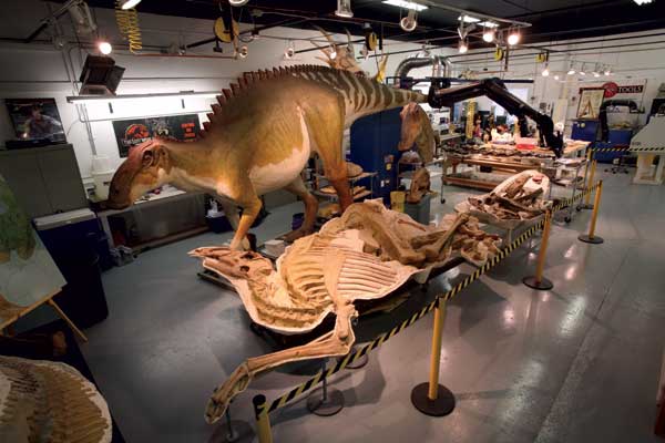 תחנה 1: מוזיאון הרי הרוקי בבוזמן המסע בעקבות הדינוזאורים התחיל לאחר ביקור מרתק בן כמה ימים בשמורת ילוסטון הסמוכה לגבול מונטנה. הנסיעות בדרכים ההרריות ובנופי בראשית הכניסה אותנו לחוויה הקדמונית. תוך כדי נסיעה במעלה ההר צצו מפעם לפעם שלטים שדיווחו לנו לאיזו תקופה פרה–היסטורית נכנסנו זה עתה. הכביש המתפתל בין התקופות השונות הפך את הנסיעה למסע אל ההיסטוריה של כדור הארץ: רגע אחד אנחנו בתקופת הטְריאס, ואחרי טיפוס קל – עברנו לתקופת היורה. בוזמן (Bozeman) היא עיר קטנה במושגים של אמריקה. 32 אלף איש בלבד חיים בה. בעיר נמצא המוזיאון הראשון שביקרנו בו: מוזיאון הרי רוקי (Museum of the Rockies). בכניסה מקדם את פנינו שלד של טירנוזאורוס, טורף ענקי, המתנוסס לגובה של יותר מארבעה מטרים ושאורכו כ–12 מטרים. רוב הציבור מכיר אותו בשם טי–רקס. לא רק בני נוער או ילדים מסתובבים כאן בעיניים פעורות ובקולות השתאות למראה השרידים של היצורים הענקיים – המוזיאון הזה מספק חוויה מלהיבה לכל גיל. אוצר המחלקה הפליאונטולוגית של המוזיאון הוא חוקר מפורסם בשם ד"ר ג'ק הורנר, ששימש יועץ בסרטי "פארק היורה". כהרגלם של חוקרים רבים, הוא מנסה לנפץ מיתוסים, ובעזרת סרט מרשים שהכין הוא מנסה לשכנע אותנו כי הטי–רקס – הטורף המרשים שכיכב בסרטים – הוא לא יותר מאוכל נבלות גדול. המעבר החד מחדרי התצוגה של הדינוזאורים לשחזור תחילת ההתיישבות בארצות הברית היה מפתיע. לאמריקאים, כך נראה לפחות לפי התצוגות, יש שתי תקופות חיים: אחת מלפני כמאתיים מיליון שנה, עת התרוצצו דינוזאורים במרחבי ארצם, והופ – הם מתיישבים ברחבי ארצות הברית. כל מה שבין שתי התקופות האלה נמצא כנראה בחדר צדדי שלא הצלחנו למצוא במוזיאון. נדמה שעברם המפואר של שבטי האינדיאנים שגרו באזור במשך אלף שנה לפחות מוצנע או מוצג במוזיאונים המיועדים לילידים.