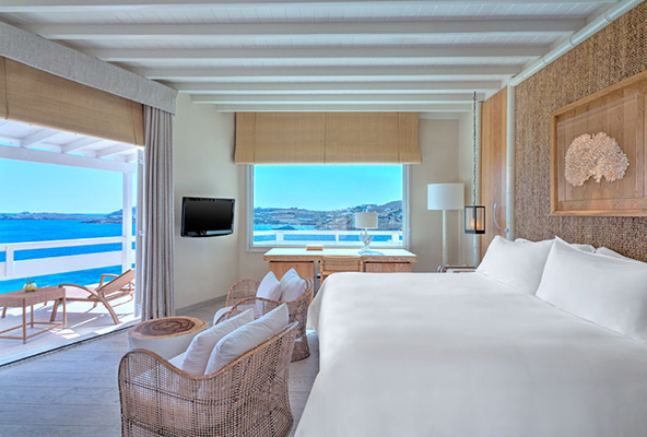 במזרח מיקונוס: חוף Kalo Livadi הוא אחד החופים הארוכים במיקונוס ויש בו תשתיות מפותחות, כמה טברנות טובות ומלונות קטנים. למרות הפופולריות שלו, בזכות אורכו אפשר למצוא בו בקלות פינה שקטה. חוף kalafati הוא חוף גדול ויפה החביב על גולשים ומוצעות בו מגוון של פעילויות ספורט ימי. במערב מיקונוס: Agios Stefanos הוא חוף חולי מפותח מאוד ומוגן מרוחות הנוטה להיות עמוס בשל קרבתו הרבה לבירת האי. Ornos הוא חוף תיירותי החביב על משפחות, ובו הרבה מסעדות וברים וגם בית ספר לגלישה. Agios Ioannis הוא אחוף קטן ונעים במרחק כ-4 ק"מ מבירת האי ויש ממנו תצפית יפה על האי דלוס. למרות שמדובר בחוף נוח עם מיטות שיזוף ומסעדה טובה, הוא לא עמוס מדי. איפה ישנים במיקונוס?במיקונוס יש מגוון מלונות לכל טעם וכיס – ממלונות משפחתיים קטנים ועד מלונות של חמישה כוכבים דלוקס עם כל הפינוקים. אנחנו נמליץ כאן על שני מלונות יוקרתיים, ששניהם מתאימים מאוד לזוגות המחפשים חופשה רומנטית ואיכותית. Santa Marina. מלון יוקרה ששוכן על רצועת חוף פרטית באורנוס. במלון 100 חדרים, סוויטות ווילות, שכולם עברו לאחרונה שיפוץ מקיף. כל החדרים מעוצבים בטוב טעם וכוללים מרפסת פרטית המשקיפה לים, וחלק מהסוויטות והווילות מצוידות בבריכה פרטית. על החוף של המלון ניתן למצוא בר אופנתי ומתוחכם שמציע תפריט פיוז'ן אסייתי, קוקטיילים ודי.ג'יי שמנגן מוזיקת עולם וצ'יל אאוט. בנוסף לבריכת מי ים ובריכת ילדים, יש גם ספא עטור שבחים. אתר המלון