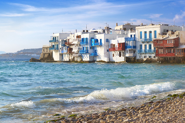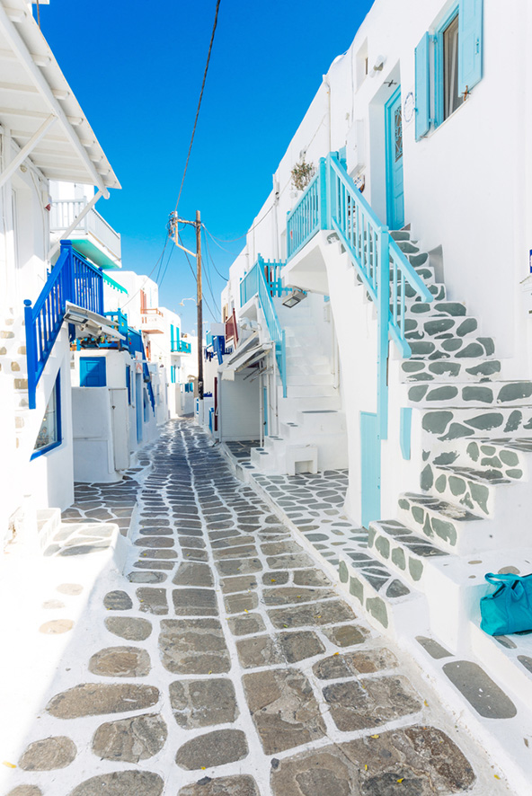 האי מיקונוס משתייך לאיים הקיקלאדיים, שאליהם משתייך גם האי סנטוריני. כמו כל האיים הקיקלאדיים, גם מיקונוס נראה כאילו נלקח מתוך גלויה של אי יווני – בתים מסוידים בלבן עם תריסי עץ כחולים, רחובות מרוצפים באבן, כנסיות לבנות עם כיפות כחולות. למרות הארכיטקטורה המסורתית, האווירה במיקונוס היא קוסמופוליטית, והאי, שנחשב לאחד מהיוקרתיים באיי יוון, מושך בליינים רבים ואוהבי מסיבות ונחשב גם ליעד פופולרי בקרב הקהילה הגאה. לצד אלה, האי חביב מאוד על זוגות בירח דבש, הודות לריכוז גבוה במיוחד של מלונות יוקרה מעוצבים להפליא. החנויות שנמצאות בבירת האי חורה (Chora), המכונה גם מיקונוס טאון, מחזקות את התדמית היוקרתית, וכוללות חנויות אלגנטיות של מעצבי אופנה בינלאומיים שנדיר למצוא באיי יוון. לקריאה נוספת: