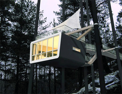 עבור כל מי שתמיד חלם בילדותו על בית בעץ, כזה שאפשר לרבוץ בו בימי הקיץ הארוכים, לארח חברים ולהמתיק סודות, החלום הזה יכול להתגשם במקום הכי רחוק מהגינה הביתית. בכפר האראדס (Harads) שבצפון שוודיה, 60 ק"מ מהחוג הארקטי, עומד להיפתח בימים אלו מלון חדשני וסופר מודרני, שכל חדריו נמצאים על גבי עצים. בשלב הראשון יכיל המלון, שנקרא בפשטות Treehotel, ארבעה חדרים בעלי עיצוב פורץ דרך וייחודי – כל חדר עוצב על ידי אדריכל אחר, מהמובילים בתחום. באוקטובר ייפתחו שני חדרים נוספים, כשהמטרה הסופית היא להקים בתוך חמש שנים 24 חדרים בעיצובם של 24 אדריכלים.