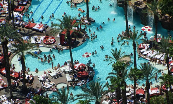 Flamingo, לאס וגאס אם מלון Mandalay Bay פונה לקבל צעיר וחובב מסיבות, הרי שמלון Flamingo הוותיק ששוכן במרכז הסטריפ פונה לקהל של משפחות, ובו בריכה יפה המעוצבת כלגונה ומוקפת בגנים מטופחים. בבריכה יש מפלי מים, סלעים ומערות שביניהם מתפתלות מגלשות מים שהופכות את החוויה למהנה במיוחד. גם למבוגרים יש בריכה משלהם, עם מסיבות ואווירה של מועדון לילה. למשפחות מחכה במלון אטרקציה נוספת: שמורת חיות בר שבה ציפורים אקזוטיות, דגים וצבים. כתובת: 3555 S Las Vegas Blvd, Las Vegas להשוואת מחירים למלון זה לחצו כאן>>  הבריכה של מלון Flamingo. מעוצבת כלגונה עם מפלי מים וצמחיה טרופית | צילום: Loozrboy Golden Nugget, לאס וגאס בלאס וגאס הכל חייב להיות נוצץ ומרשים, ורבים המלונות שמתהדרים בבריכות יוצאות דופן, אבל אם צריך לבחור רק בריכה אחת שתשאיר אתכם פעורי פה הרי שזו הבריכה של מלון Golden Nugget. מתחם הבריכה המרשים כולל מפלי מים, ג'קוזי חיצוני, בר, מועדון אקסקלוסיבי ובריכת אינסוף שמיועדת לאורחים בני 21 ומעלה. שיא השיאים של מתחם הבריכה הוא האקווריום הענק שבו שוחים דגים אקזוטיים לצד חמישה מינים של כרישים. אם תרצו לראות אותם ממש מקרוב תוכלו לגלוש במגלשת מים שקופה בגובה שלוש קומות שממוקמת בליבה של בריכת הכרישים. מלבד זאת יש במלון קזינו, ספא, היצע רחב של מסעדות וברים ותכנית עשירה של מופעי בידור וקונצרטים. איפה? 129 Fremont Street Experience, Las Vegas להשוואת מחירים למלון זה לחצו כאן>>