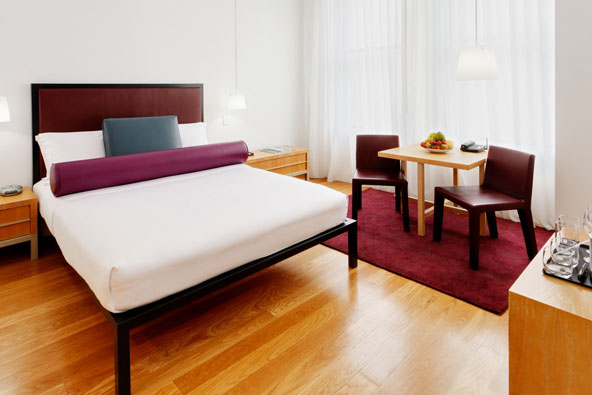 Bryant Park Hotel מלון אמנותי ומעוצב החביב על אושיות אופנה, שחקנים ואמנים. כפי שהשם מעיד, המלון סמוך לבריאנט פארק, אחת הדוגמאות המוצלחות לפריחה וההתחדשות האורבנית של האזור, שפעם היה מוכה פשע וסמים והיום הוא שוקק חיים ואירועים. בכל החדרים יש רצפת פרקט, שטיחים בעבודת יד, רהיטים מעור ומרצפות שיש בחדר האמבטיה. ואם אתם מתכננים לסגור עסקה בזמן שאתם נמצאים בניו יורק, תוכלו ללון בסוויטה חדר הישיבות (Boardroom Suite), שבה יש שולחן ישיבות עם 10 כיסאות, אידיאלי לפגישת עסקים דיסקרטית. במלון יש חדר כושר (אפשר להזמין מאמן אישי), אולם קולנוע קטן, בר-מרתף יינות ומסעדה יפנית נחשבת, Koi Restaurant. איפה? 40W 40th Street להשוואת מחירים במלון זה לחצו כאן >> חדר ב-Bryant Park Hotel. רצפות פרקט ורהיטים מעור בעיצוב נקי | צילום: Bryant Park Hotel ©
