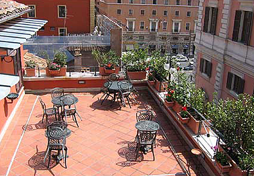 מרכזי ושקט ברומא לא חסרים מלונות קטנים, נעימים ומרכזיים. אחד המוצלחים שבהם הוא מלון Lancelot, מלון משפחתי ששוכן בשכונת מגורים שקטה במרחק הליכה מהקולוסאום. החדרים מרווחים וממוזגים עם רצפות עץ או שיש, וכוללים מקלחת צמודה, טלוויזיה, כספת ואינטרנט אלחוטי. בחלקם יש מרפסות מקסימות. שניים מהחדרים מתאימים לנים בכיסאות גלגלים. הצוות אדיב במיוחד ודובר אנגלית, וזה לל לא מובן מאליו באיטליה. בנוסף לארוחת הבוקר המוצלחת אפשר ליהנות במקום גם מארוחת ערב ומבר חמים ואלגנטי. בקיץ אפשר ליהנות ממשקה בפטיו המוצל. Hotel Lancelot מחיר: החל מ-150 אירו לזוג ללילה, כולל ארוחת בוקר. כתובת: Via Capo D'Africa 47 אתר אינטרנט  | | מלון Parlamento. מרפסת גג מקסימה |