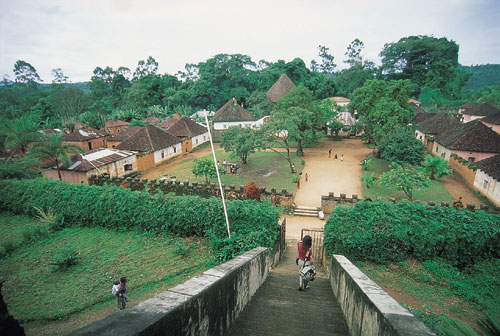 (טיפ, בקשיש). את אותו המרחק שעברנו אז ביותר משש שעות, גמאנו הפעם בתוך שעתיים בלבד, מרחמים על ידית ההילוכים וההגה שנמעכו תחת ידיו האימתניות של מודו. את מסענו התחלנו לאורך "כביש הטבעת" שבצפון־מערב קמרון, אזור הררי לא גבוה שעדיין מכוסה בחלקו ביערות גשם ובו ריכוז גבוה של מלכויות. פה צילמו את אחד מסרטי "טרזן". לאורך כביש הטבעת פזורות מלכויות רבות, בהן פומבן (Foumban) ובבאנג'ו (Babanjou), בה לפון יש ארמון בוץ ומחסנים מלאים פסלים שנצברו במשך דורות. הפון של בבאדג'ו (Babadjou) הוא ה־17 בשושלת המלוכה. לאביו היו יותר ממאה צאצאים, מתוכם 57 בנים, שמהם בחר אביו בן ליורשו. הפון של בפוסם (Bafoussam), לדבריו, הוא כבר ה־97 בשושלת. בביקורנו סיפר לנו כי היה שקוע בלימודי התואר השני בפיזיקה כאשר אביו נפטר ונודע לו כי הוא נבחר לרשת את מקומו. 500 ילדים בפנקס ספירת המדרגות בכניסה למבנה שבו התגורר דארל בעת שהותו במקום ושכיום משמש בית הארחה נעשתה ככל הנראה לאחר שהפון וג'ראלד שתו כוסות רבות של וויסקי. בהתרגשות רבה ירדתי גם אני בגרם המדרגות וספרתי כל אחת ואחת מהן. איזו אכזבה – בסך הכל חמישים ושלוש מדרגות.