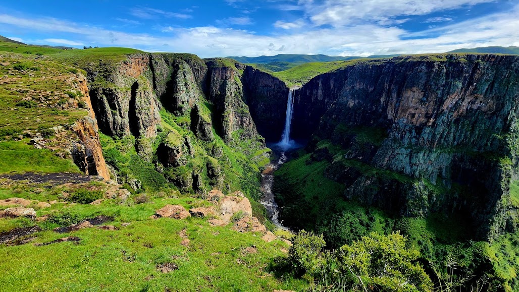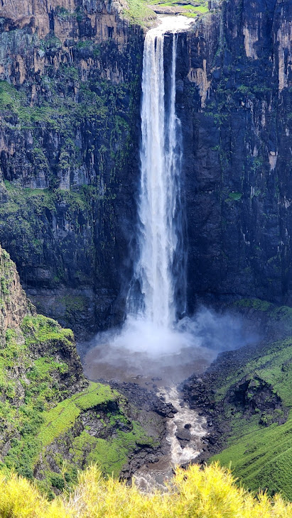 בבוקר ניכרה תכונה של המטיילים, לצאת ליום של פעילות. רבים מהם התארגנו לרכיבה על סוסים, המכונה כאן משום מה "Pony Trek". ההליכה למפלי Maletsunyana המפורסמים אורכת כשעה וחצי הליכה לכול כיוון ולאחר גשם כה עז, בבוץ שנוצר, עלולה להתארך באופן משמעותי. ממרכז המבקרים שייפתח בקרוב, תהיה תצפית מרשימה על המפלים. אך מכיוון שזה עדיין סגור, ירדנו בשביל צר, מול נערה בודדה שפסעה מולנו. הלכנו דרך הקרקע הבוצית השחורה, שהתרוחחה מסלעים וולקניים קדומים. חיש קל הגענו, בנעליים רטובות, אל שפת הקניון, ממנו אל דרגש סלע ענקי, שבלט מעליו וממנו נשקף לנגד עינינו קניון אדיר, שדומה ואיזה ענק קדמון, או אחד האלים, פילח אותו בגרזנו. פלא הבריאה ממש. הקניון הסתעף לצדדים ומכול עבר נראתה שלוחה שלו, כשמכל ערוץ הסתעף ערוץ נוסף. כמו עץ שחפור עמוק בקרקע. השמש שהגיחה מבעד לעננים, שלחה קרניים נדיבות, ששטפו את הקניון באור רך. ממש מולנו, בתוך השקט הפראי, בלב אותו הוד קדומים, אליו יד הקדמה והפיתוח טרם הגיעה, ירד מפל ענק, שגובהו כ-200 מ', לתוך בריכה מים טבעית כשהוא מעלה קצף רב. זוהי כנראה הסיבה להוראת שמו "מקום העשן". יופיו של המפל אינו טמון דווקא בגובהו ואפילו לא רק בכמות המים האדירה הזורמת בו, אלא במיקום שלו בתוך תיאטרון טבעי שנוצר בסלע, עם מצוקים מפולשים כתפאורה. ברקע נראו מפלים נוספים, קטנים בהרבה. ניתן להגיע לכאן ברגל מהלודג', אלא להמשיך לשפת הקניון, מהלך של יום הליכה לערך, המזמן מבט על הקניון מאלף זוויות.