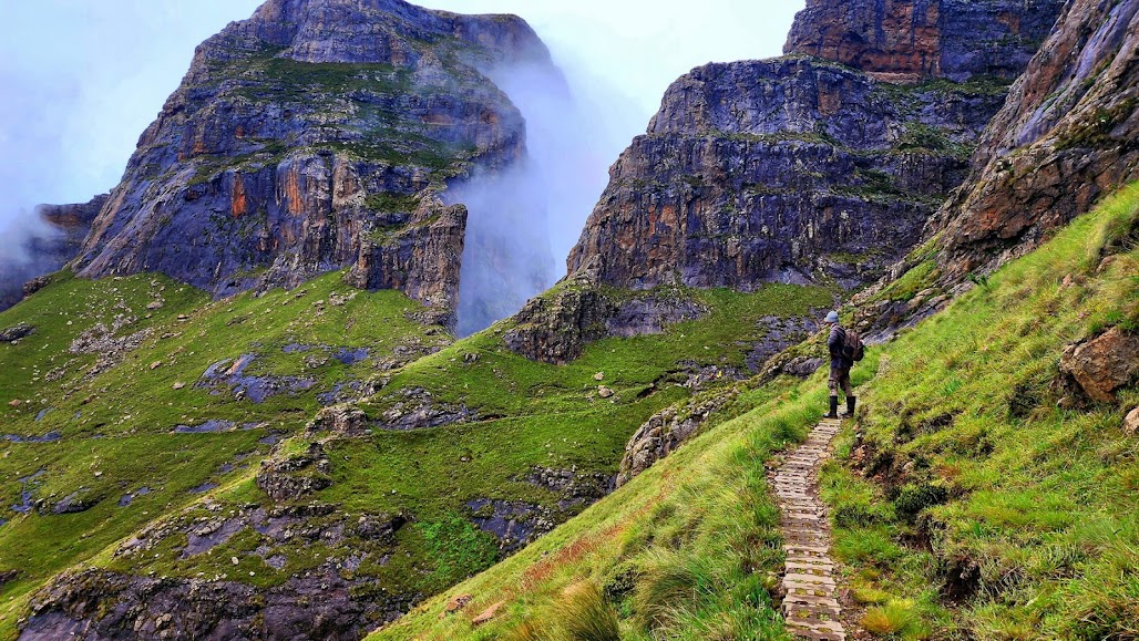 הרוח שרקה בעוז. הגשם הצליף בפנים. אבל דניס נראה אופטימי. ניכר עליו שהוא מכיר את ההר מאה מונים טוב ממני. הוא גדל למרגלותיו וראה כבר הכול. התחלנו לטפס. אנו מעל לקו העצים. בשלב זה של היום, הנוף היה מכוסה בעננים. היינו אמורים לראות מכאן עולם ומלואו. זהו כנראה המחיר לכך שמגיעים בעונה הגשומה. את השגרה המאפירה קטעו פרחי בר רבים מאד, בשלל צבעים: אדום, סגול, צהוב, וורוד, כתום, ועוד הרבה גווני ביניים. היו שם סחלבים גבוהים, אירוסים קטנים ועוד כמה מינים, המשמשים כעשבי מרפא. בשלב מסוים, נראו דרך הערפל צלליות של הרים, קווי רכס מטושטשים, שהלכו והתבהרו. מתוך שמיכת הפוך הערפילית הציצו הרים, שנראו כאיים מרחפים בשמים. כעבור זמן הגשם פסק, האוויר התחמם, ארזנו את המעילים ואפילו הזדקקנו למשקפי השמש. נראה היה שאנו מנצחים את התחזית ואת הסטטיסטיקה. פסענו לאורך המצוק, מתבוננים בהשתאות בהוד קדומים, בארץ פרועה ומבותרת, בולעים את הנוף ללא שובע. אולם כעבור כשעה של חסד, נסגר חלון ההזדמנויות ושוב נאלצנו להתכסות במעילים, כשהגשם הבלתי פוסק, מצליח לחדור את מעטה הפלסטיק והגומי. טיפסנו דרך סלעים לנקיק צר ועמוק. בעבר ניתן היה לטפס מכאן למקומות אחרים, אבל לפני כמה שנים, כתוצאה ממפולת, הדרך נחסמה. בראש נקיק ראינו ארבעה דרום-אפריקאים צעירים, שחזרו מטרק בן כמה ימים, כשאת כול ציודם הם נושאים על גבם. הצעירים ששבו מכמה ימי הליכה, סיפרו לנו שהמפל מתכסה לעתים בערפל, אבל אם נמתין שעה או שעתיים, לבטח נזכה לראותו.