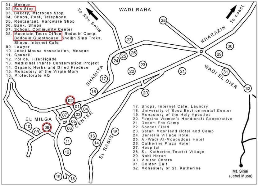 - מנזר סנטה קתרינה – מהמנזרים היוונים-אורתודוכסים היפים בעולם, עם אוסף האיקונות וכתבי העתיק העתיקים ביותר (פתוח לביקורים רק בבוקר). ממנו ניתן לצאת למסלול אחד בלבד – לג'בל מוסה, בהליכה בשביל הרחב, או ברכיבה על גמל ודליל מקומי (מסלול של שעה וחצי הליכה לכל כיוון).