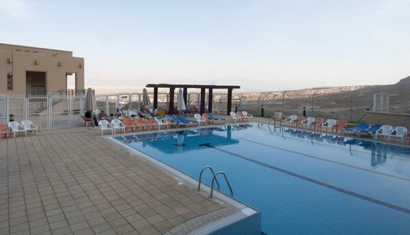 בריכת השחייה של אכסניית אנ"א מצדה. להתרענן מול נופי מדבר