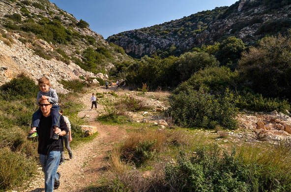 פירוט המסלולאחרי שמצאתם את סימון השבילים האדום, התקדמו ישר בדרך עפר, שלצידכם מטעים ועצי ברוש. בחורף תוכלו לראות פריחה מדהימה כבר מתחילת המסלול, כשהכלניות האדומות בולטות בצבען החזק. אחרי שתעברו שער, תגיעו לפיצול שבילים – אדום וכחול. לפניכם שלוש אפשרויות טיול: השביל האדום יוביל אתכם לשרידי מחצבה עתיקה. שימו לב לסלעים, עם קצת מזל אולי תזכו לראות שפן סלע. לאחר מכן תתחילו לטפס בתוך אפיק הנחל. מסביבכם תוכלו לראות עצי אלון, אורן ירושלים, ער אציל, שיחי אלת המסטיק ובעונה – רקפות בהירות שמנקדות את גושי האבן שעליהם תטפסו.