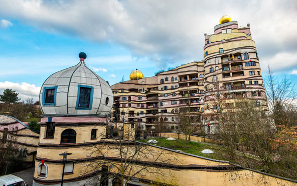 דרמשטדט: חגיגה אדריכלית מפרנקפורט נצא בכביש המהיר A5 לכיוון דרום ובתוך כ-40 דקות נגיע לדרמשטדט (Darmstadt), עיר מרתקת הנחשבת למרכז המדעי של גרמניה. בעיר יש אוניברסיטה ידועה ומרכז העיר שוקק חיים ומלא מסעדות, ברים ובתי קפה ויש בו חנויות רבות. הפארק העירוני הוא מקום שטוף שמש ומתאים מאוד לטיול ולפיקניק – בקיץ נערכים בו קונצרטים ומופעים באוויר הפתוח. חובבי אדריכלות יחגגו כאן עם שלל סגנונות מרתקים. נציג בולט של העשורים האחרונים הוא ה-Waldspirale (ספירלת היער, בגרמנית), קומפלקס מגורים צבעוני בצורת ספירלה שנראה כאילו יצא מתוך סיפור ילדים. מתנועת האר נובו, שדרמשטדט שימשה מרכז חשוב שלה, נותרו בעיר כמה מבנים נפלאים, בהם מגדל החתונה. מגדל נוסף מתקופה עתיקה בהרבה הוא המגדל הלבן (Der Weiße Turm), אחד השרידים האחרונים של חומות העיר העתיקה. "ספירלת היער", אחד המבנים המרתקים בדרמשטדט