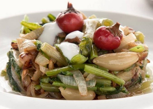 שראביכ, ראמה פעם צמחוני שביקר במסעדה ערבית ידע שעליו להסתפק במשולש הנצחי של חומוס-צ'יפס-סלט. אבל בשנים האחרונות נפתחו, בעיקר בגליל, מסעדות ערביות שמגישות את מגוון עשבי הבר שצומחים בגליל, והתוצאה היא פשוט חגיגה לצמחונים ולטבעונים. אחת המסעדות שמצטיינות במאכלים מהסוג הזה היא שראביכ שבכפר ראמה. יעקוב חיאט מגיש במסעדה הקטנה והצנועה שלו מנות של עשבי בר גליליים כמו גרגיר נחלים, עולש וחובזה, לצד חומוס נהדר, פטאייר זעתר ותרד, כרובית בטחינה, קישואים ביוגורט, חצילים מטוגנים עם טחינה ורכז רימונים, סלט עדשים, עלי גפן ממולאים, קובה צמחוני ועוד מנות נפלאות. וכן, למי שממש לא יכול בלי, יש גם בשרים על האש, אבל גם קרניבורים מושבעים יעידו שהם ממש מיותרים פה. המחירים המצחיקים הופכים את הארוחה פה לאחת המשתלמות באזור. איפה? הכביש הראשי, כפר ראמה, טלפון: 050-9110230 .jpg) עולש בר עם בצלים מקורמלים במגדלנה. שווה להגיע לכאן ולו בשביל המנה הזו