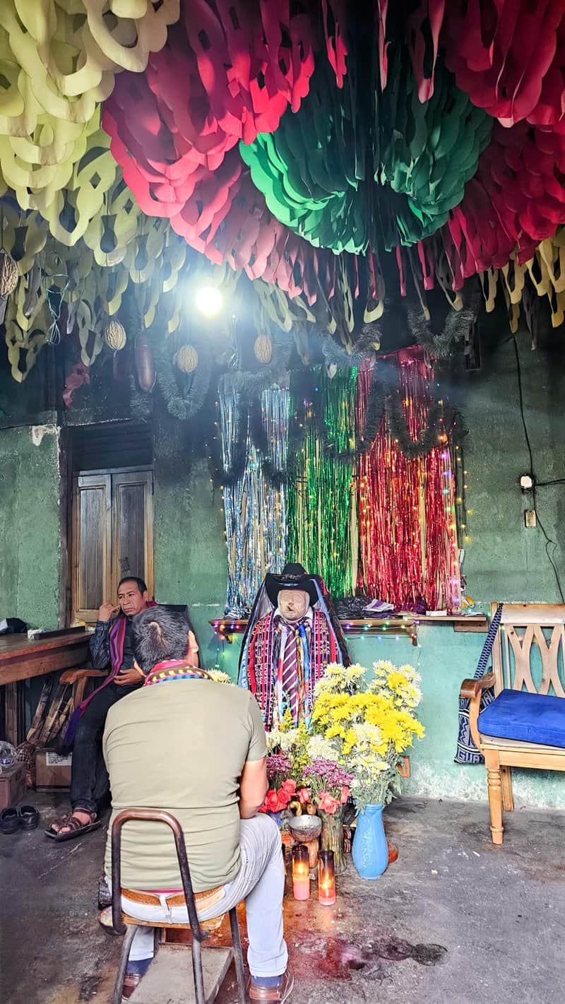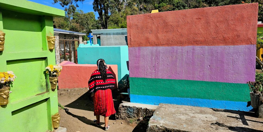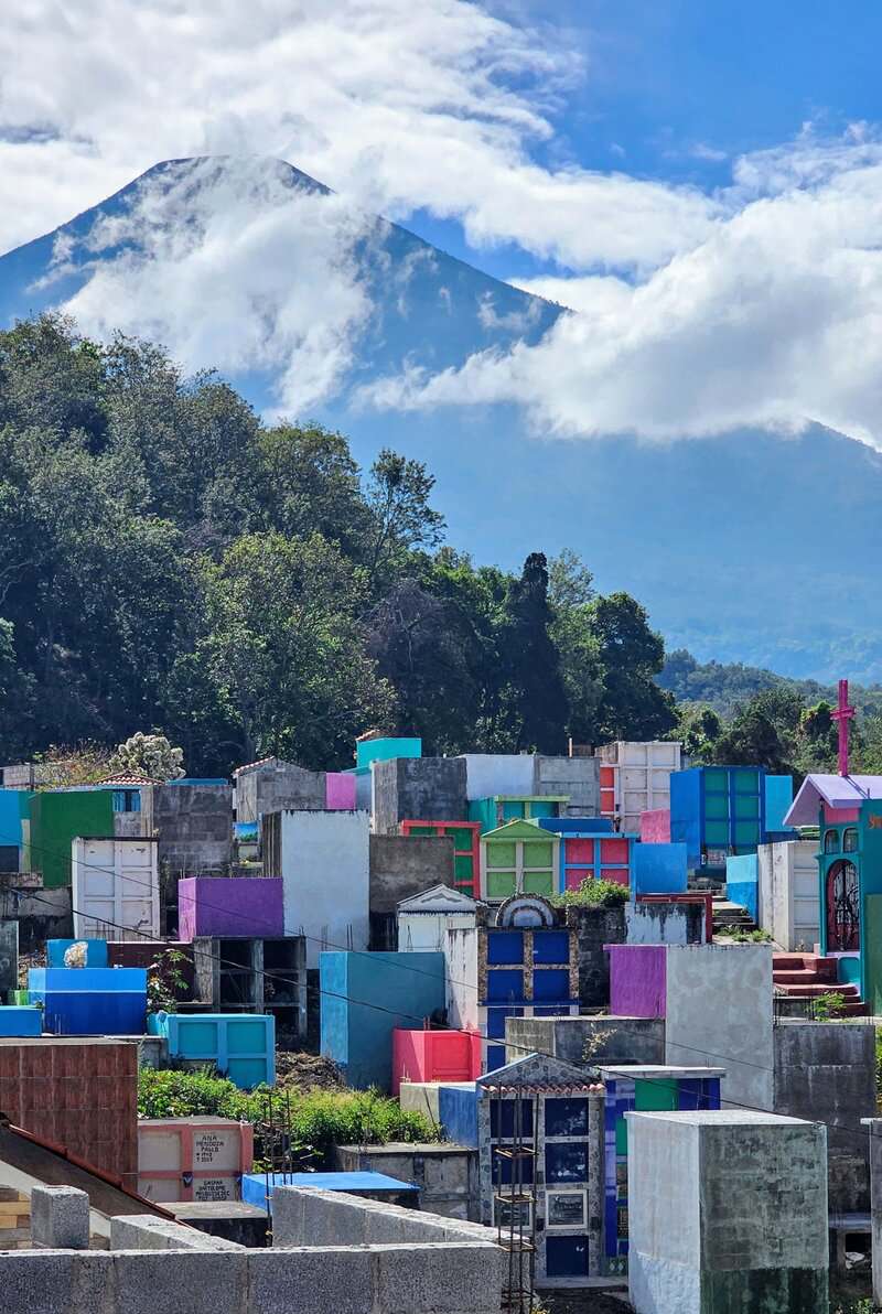 ביום שלמחרת, יצאנו לסנטיאגו, כפר הידוע בשוק הצבעוני שלו ובמסורות הרוחניות הייחודיות. עם התקרבנו למעגן, האנרגיה התוססת של הכפר מילאה את האוויר. רוזה הובילה אותנו ברחובות הססגוניים אל מקדשו של מקסימון, דמות מרכזית ברוחניות המאית. מקסימון, המיוצג לרוב כפסל עץ, הוא שילוב של מסורות ילידיות וקתוליות – סמל להיסטוריה המורכבת של האזור. מהמקדש, המשכנו אל בית הקברות של הכפר, מראה מרשים עם קברים צבועים בצבעים עזים הצופים אל האגם ומוקפים בשני הרי געש נישאים. רוזה הסבירה כי הקברים משקפים את החלוקה הסוציו-אקונומית בקהילה: חלקם פשוטים וצנועים, ואחרים מעוטרים בפאר. למרות הפערים, בית הקברות הוא מקום של אחדות, בו מתאספות משפחות כדי לחלוק כבוד לאבותיהן.